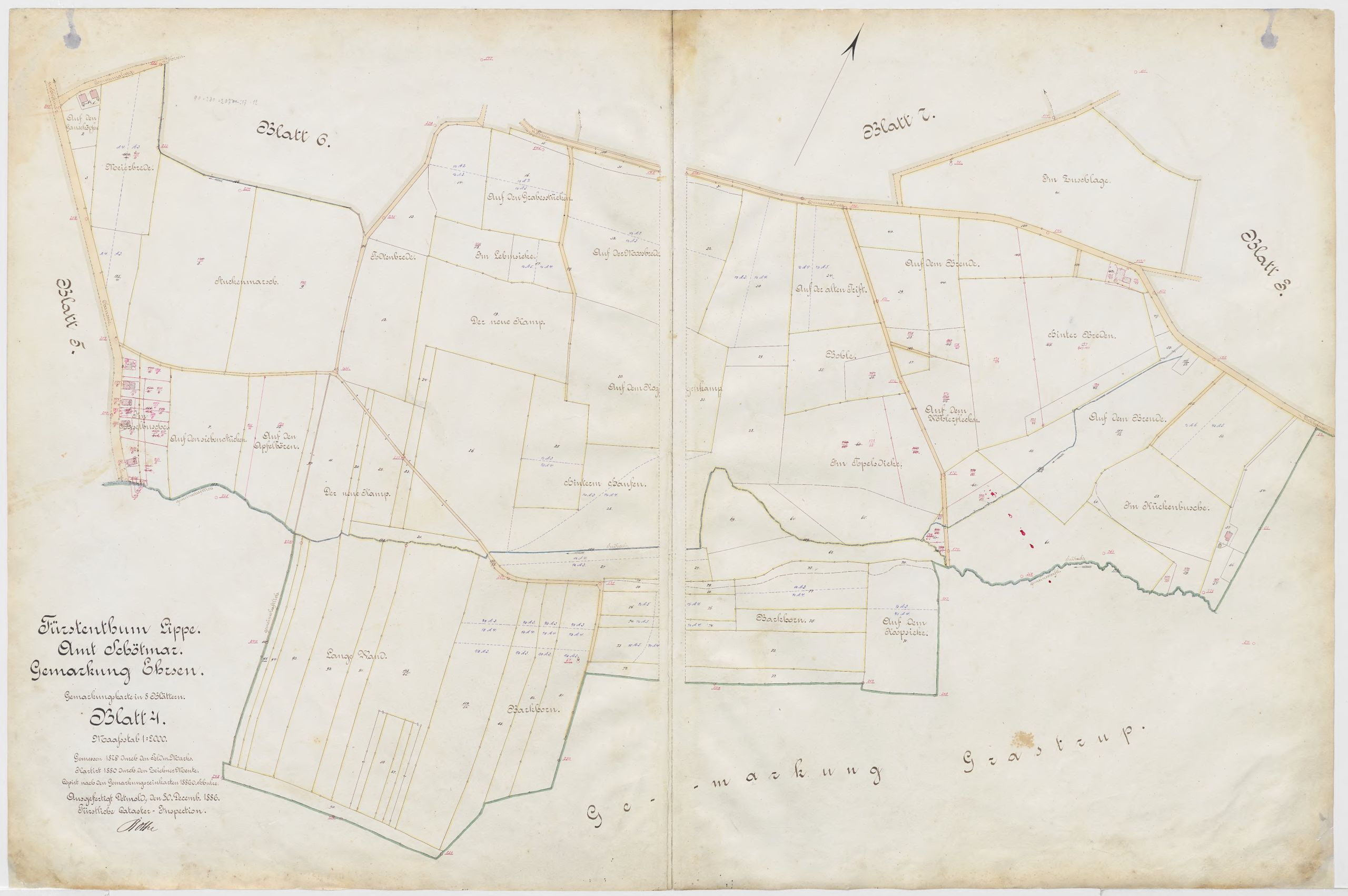 (Fürstentum Lippe, Amt Schötmar, Gemarkung Ehrsen. Gemarkungskarte in acht Blättern im Maßstab 1:1000 bzw. 1: 2000. Gemessen 1879 durch Feldmesser Marks, kartiert 1880 durch Zeichner Menke/ Eleven Abresch. Ausgefertigt Detmold 1886 durch die Fürstliche Cataster-Inspektion.)