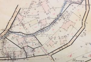Diese früheren Bauten finden sich in der Grundkarte von 1880 wieder: das Haupthaus rechts/östlich, die Leibzucht links/westlich, der Schuppen rechts oben/nordöstlich und das Backhaus mittig dicht an der Straße.