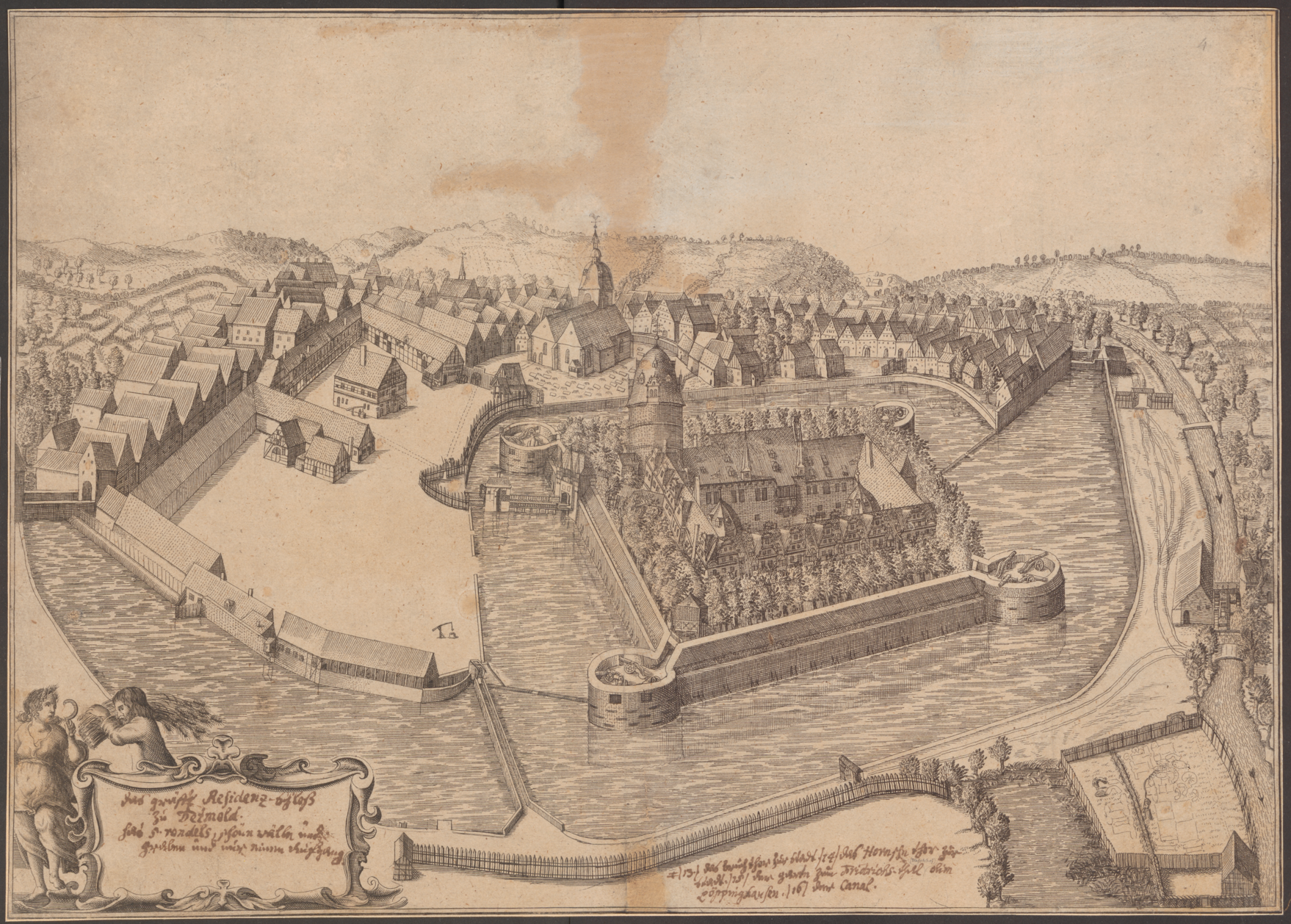 Schlossplatz und Schloss Detmold, im Hintergrund die Stadt, Kupferstich, Elias und Heinrich van Lennep, um 1663/65, LLB: 1 D 5