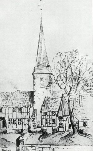 nahe dem Durchgang zum Kirchplatz. Eine Zeichnung von Emil Zeiss zeigt den Baubestand am Marktplatz in Heiden mit der Kirche im Jahre 1882. Während das Gebäude links im Bild, Marktstraße 20, noch heute i.w. unverändert besteht, wurden die beiden Fachwerkhäuser rechts im Bild abgerissen und wohl kurz nach 1900 durch massive Neubauten mit zeittypischen Fassaden ersetzt. Die beiden damals neuen Gebäude wurden mit gleichen Materialien einheitlich gestaltet und offenbar zeitgleich errichtet.