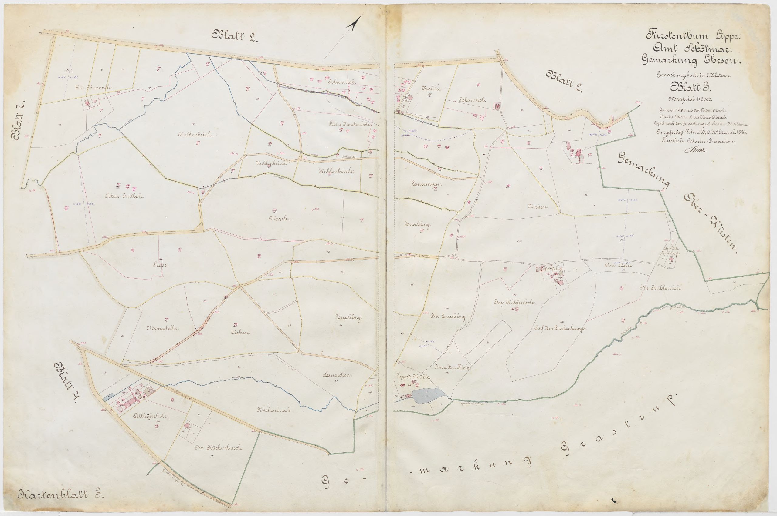 (Fürstentum Lippe, Amt Schötmar, Gemarkung Ehrsen. Gemarkungskarte in acht Blättern im Maßstab 1:1000 bzw. 1: 2000. Gemessen 1879 durch Feldmesser Marks, kartiert 1880 durch Zeichner Menke/ Eleven Abresch. Ausgefertigt Detmold 1886 durch die Fürstliche Cataster-Inspektion.)
