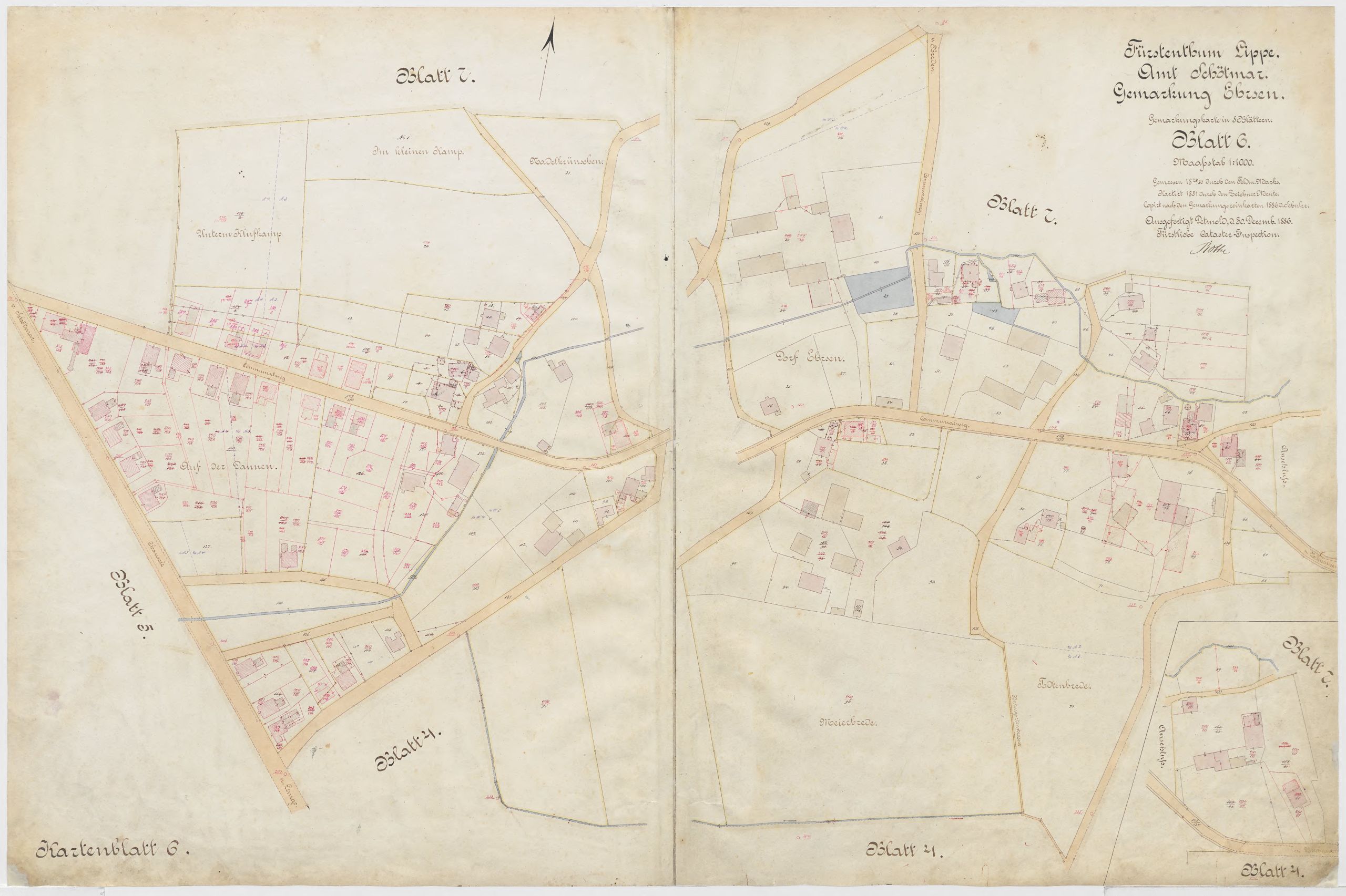 (Fürstentum Lippe, Amt Schötmar, Gemarkung Ehrsen. Gemarkungskarte in acht Blättern im Maßstab 1:1000 bzw. 1: 2000. Gemessen 1879 durch Feldmesser Marks, kartiert 1880 durch Zeichner Menke/ Eleven Abresch. Ausgefertigt Detmold 1886 durch die Fürstliche Cataster-Inspektion.)