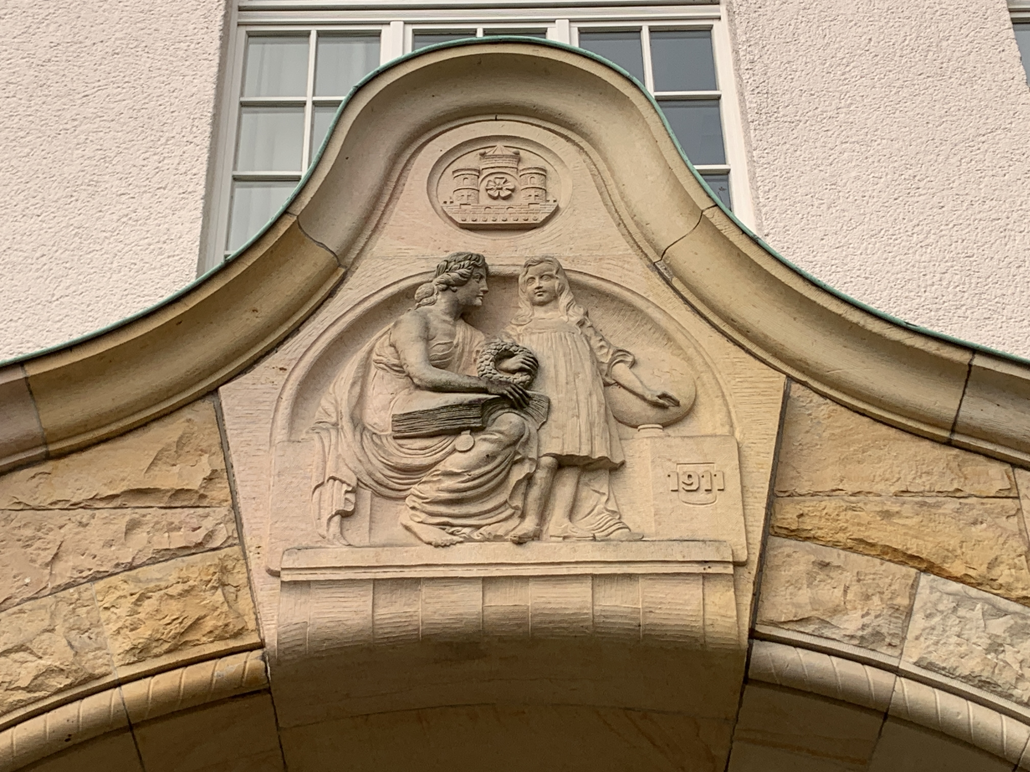 Wall 5, Schlussstein im Bogen der Portalöffnung mit Wappen der Stadt Detmold, Schulszene und Datierung 1911, 2024, Foto: Joachim Kleinmanns