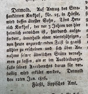 Öffentlicher Aufruf an den Anerben Kirchhof im Fürstl. Lipp. Intelligenzblatt vom 16. Juni 1816, LLB