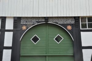 Erhaltenes Fragment einer Hausinschrift, angebracht an der Außenwand der Scheune