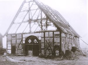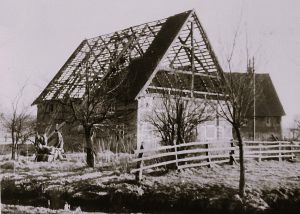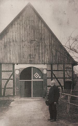Fachwerkhaus, erbaut 1755. Vierständerbau von sechs Fachen Länge mit Brettergiebeln, zuletzt mit Backsteinausfachung. Torbogen mit langer Inschrift und Tulpenmedaillons mit den Namen der Erbauer, abgebrochen 1958.