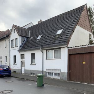 Eingeschossiger traufständiger Mauerwerkbau mit Putzfassade und Satteldach, links aufgesetztes Zwerchhaus mit Zwillingsfenster im Obergeschoss. 3 Achsen, Haustür mittig. Haus rechts durch Anbau verlängert.