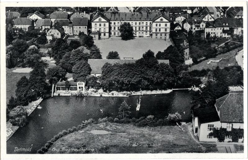 Blick über das Werre-Freibad und den Kasernenhof auf das Mannschaftsgebäude, um 1930, Fliegeraufnahme, LLB, ME-PK-18-38