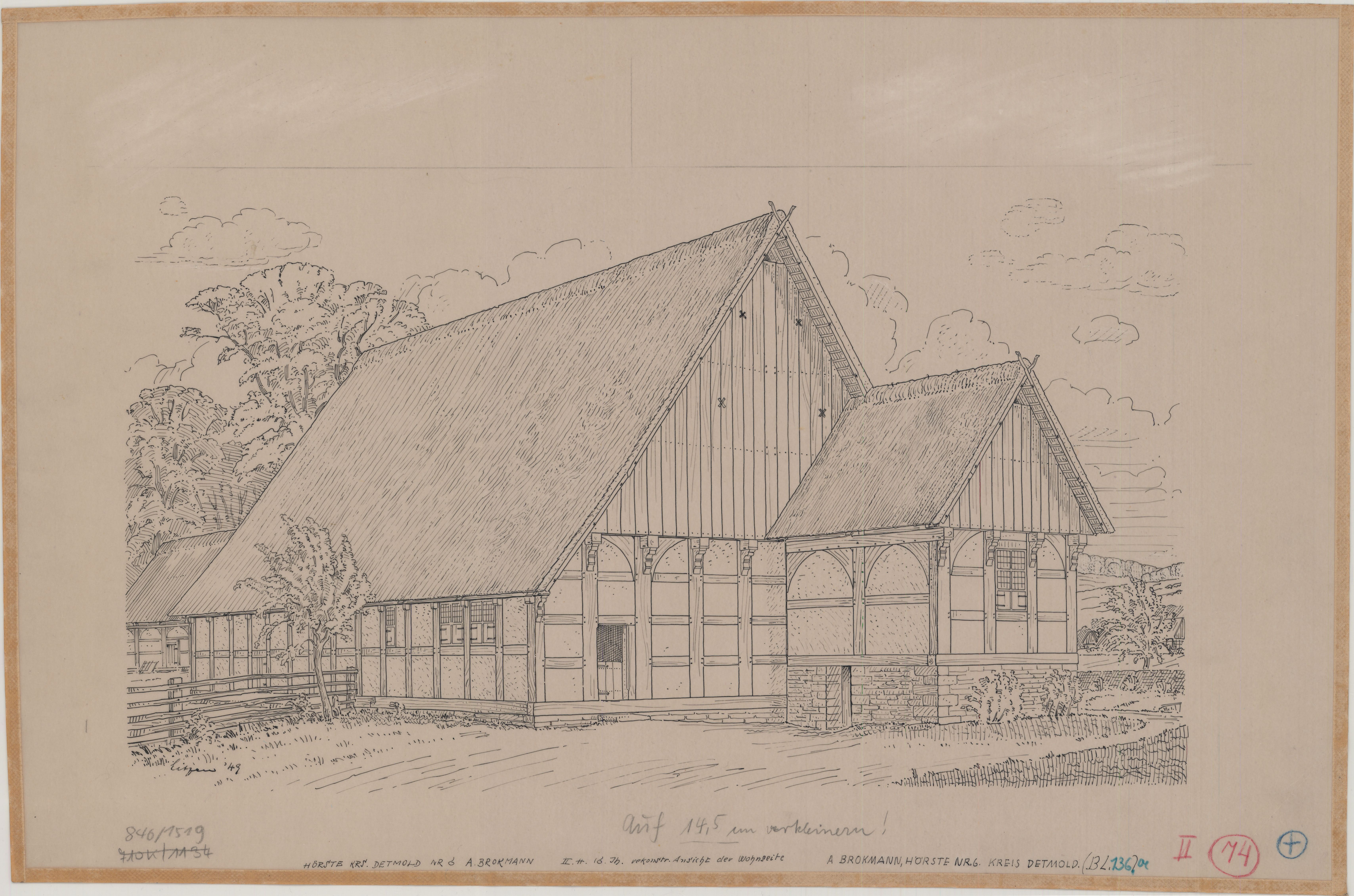Bauernhaus Hanning/Meier/Brokmann, Hörste Nr. 6: Bauaufnahme und Rekonstruktion des ursprünglichen Zustandes (rückwärtige Ansicht), (ohne Datum), Archiv LWL 846 / Kartensammlung, Nr. 846/1519