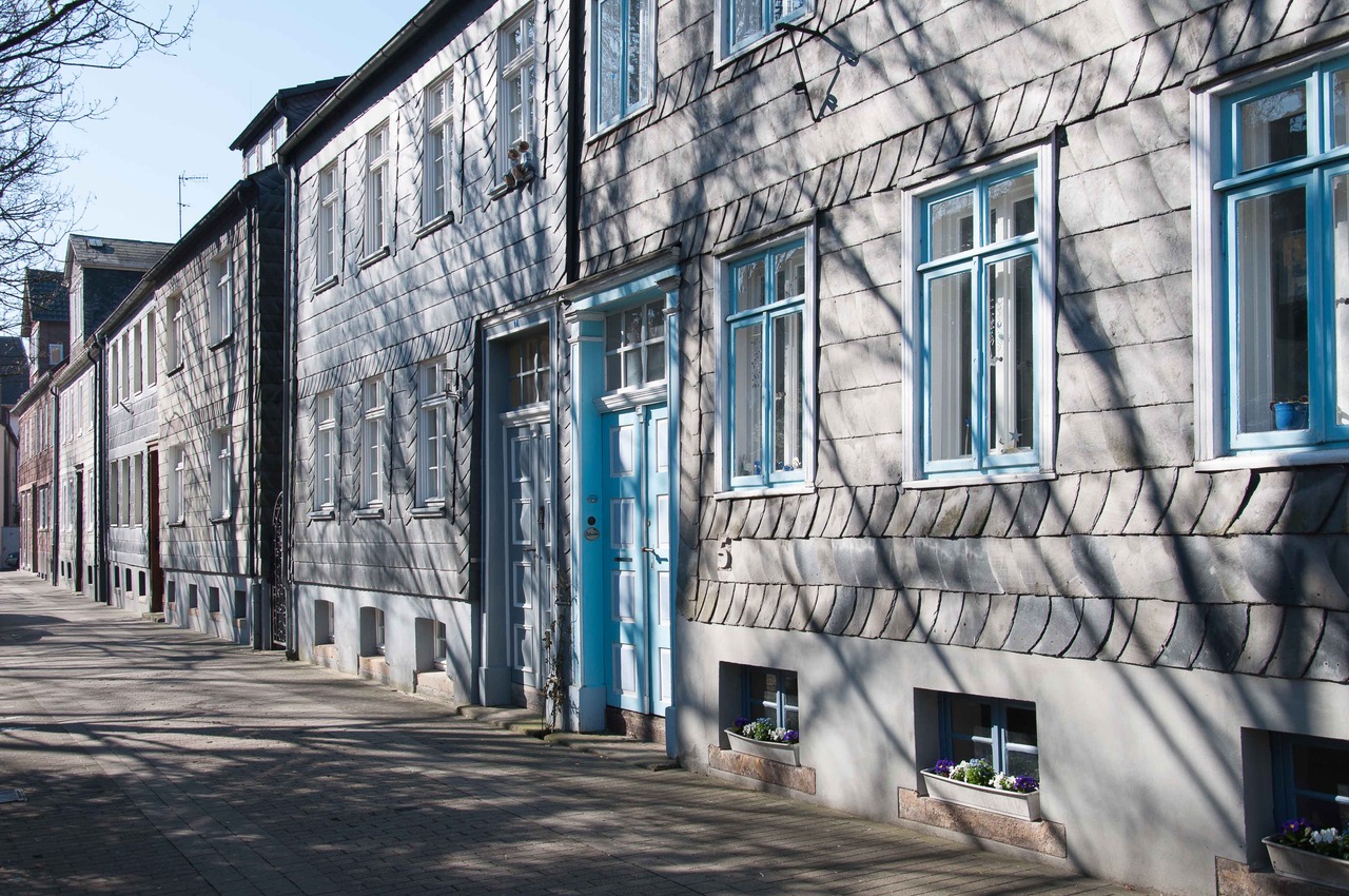 Friedrichstraße 5 und 7 (vorn rechts), dahinter 9 und 11, Ansicht von Nordosten, 2022, Foto: Joachim Kleinmanns