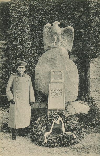 Gedenkstein von 1916 für das Reserve-Infanterie-Regiment Nr. 156 im Hof der Kaserne an der Leopoldstraße, um 1920, LLB, BA DT-30-23 (der Stein wurde beim Abriss der Kaserne 1959 versetzt an den Schützenberg)