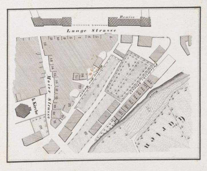 Ausschnitt aus dem Vermessungsplan der Stadt Detmold des Leutnants Reineke, Bereich Meierstraße und Friedrichstraße, 1842, LAV NRW OWL: L 77 A Nr. 104, fol. 64