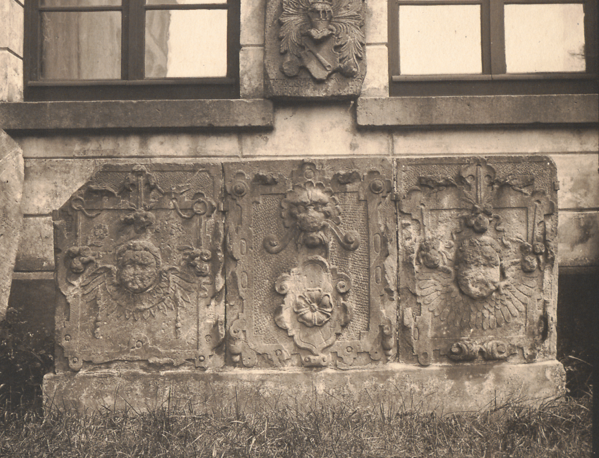 Reliefstein vom alten Rathaus, links und rechts geflügelte Engelsköpfe, in der Mitte Wappenschild mit lippischer Rose unter Löwenkopf, oben kleiner Stein mit Wappenschild und Helmzier, vor der Westseite des neuen Rathauses, Foto: Ferdinand Düstersiek, vor 1911, LLB: HSA 6, 161