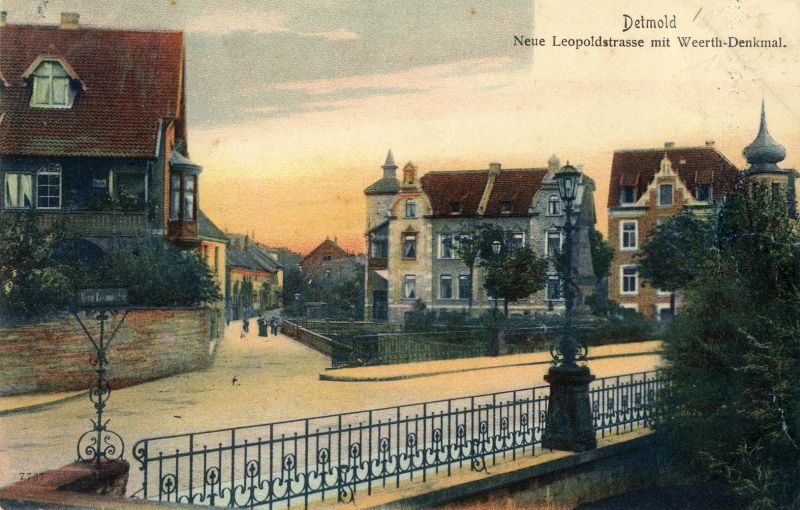 Weertplatz, um 1910, links Friedrichstraße 17, rechts Leopoldstraße 22. Dazwischen Blick in die Friedrichstraße und das Doppelhaus Weerthplatz 2 und 4, LLB, ME-PK-11-24