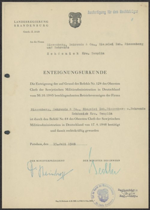 Riesenberg, Behrens & Co., Ziegelei in Zehdenick/Krs. Templin - Enteignungsurkunde 1948