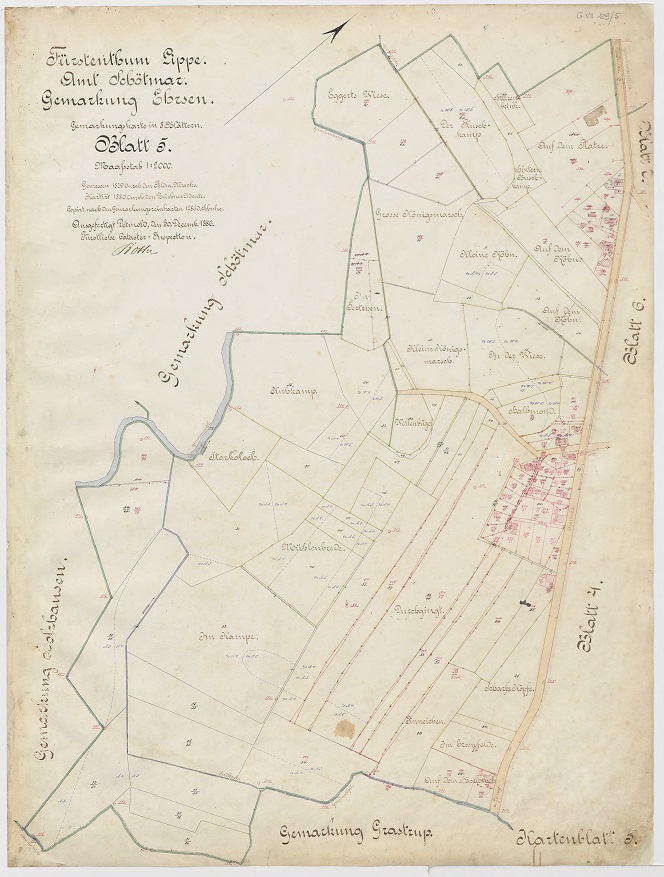 Fürstentum Lippe, Amt Schötmar, Gemarkung Ehrsen. Gemarkungskarte in acht Blättern im Maßstab 1:1000 bzw. 1: 2000. Gemessen 1879 durch Feldmesser Marks, kartiert 1880 durch Zeichner Menke/ Eleven Abresch. Ausgefertigt Detmold 1886 durch die Fürstliche Cataster-Inspektion.