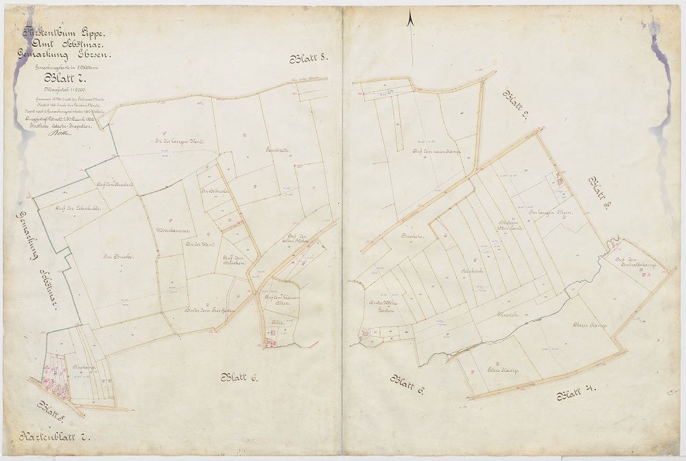 Fürstentum Lippe, Amt Schötmar, Gemarkung Ehrsen. Gemarkungskarte in acht Blättern im Maßstab 1:1000 bzw. 1: 2000. Gemessen 1879 durch Feldmesser Marks, kartiert 1880 durch Zeichner Menke/ Eleven Abresch. Ausgefertigt Detmold 1886 durch die Fürstliche Cataster-Inspektion.