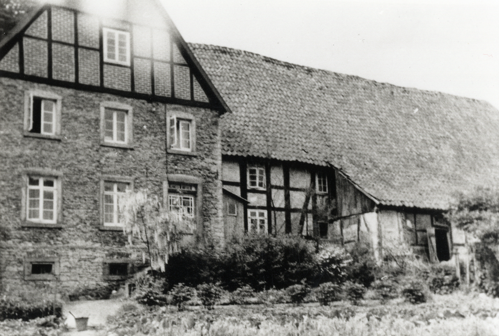 Hof Nullmeier, Haupthaus, links angebauter Wohnteil, um 1960 (LLB: ME-PK-34-101)