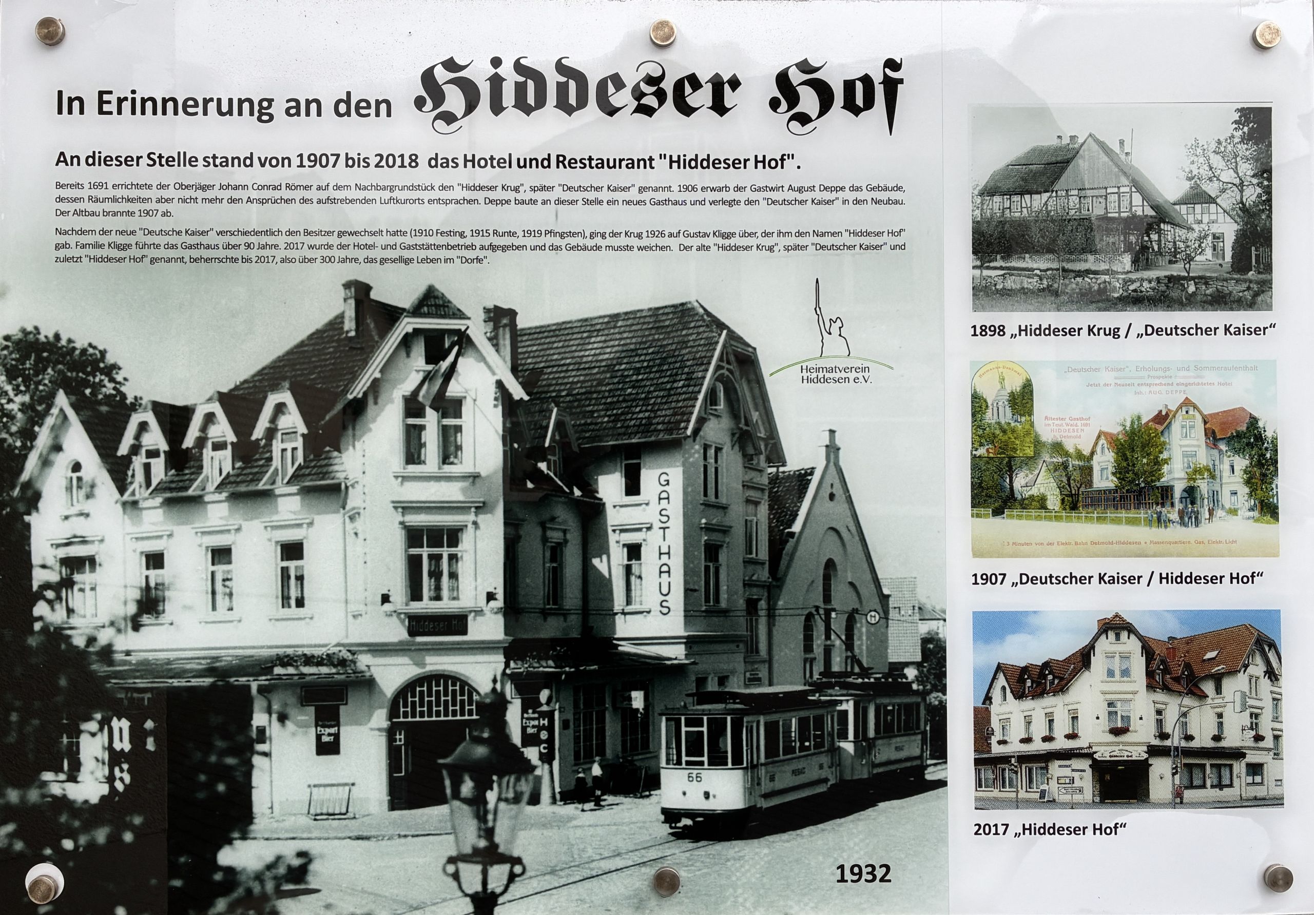 Informationstafel des Heimatvereins Hiddesen, am Neubau Friedrich-Ebert-Straße 86 zur Erinnerung an den früheren Hiddeser Hof, Foto: Joachim Kleinmanns, 2025