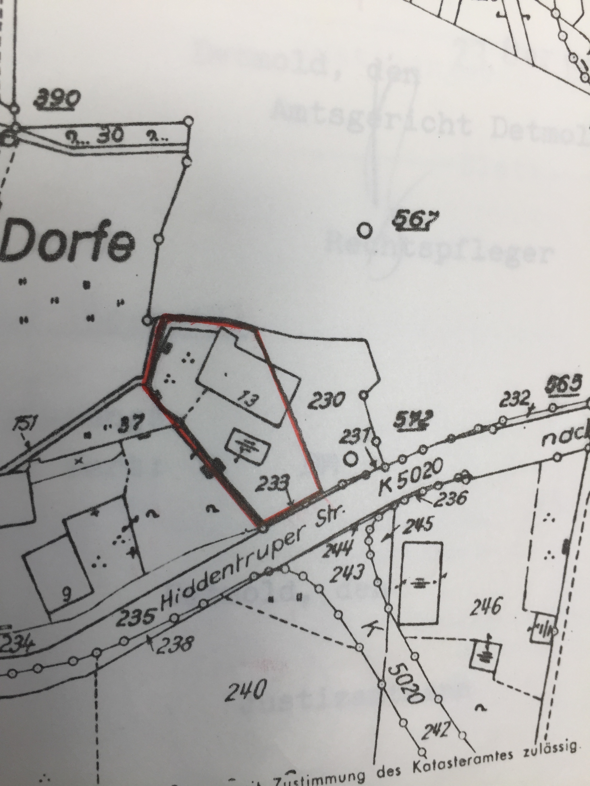 Heutiges Grundstück Hidd. Str. 11 markiert auf Flurkarte mit alten Gebäudegrundrissen (Wohnhaus u. Backhaus Hörste Nr. 6), 1980, D 23 B Detmold, Lage Bl. 3299 III, S. 272