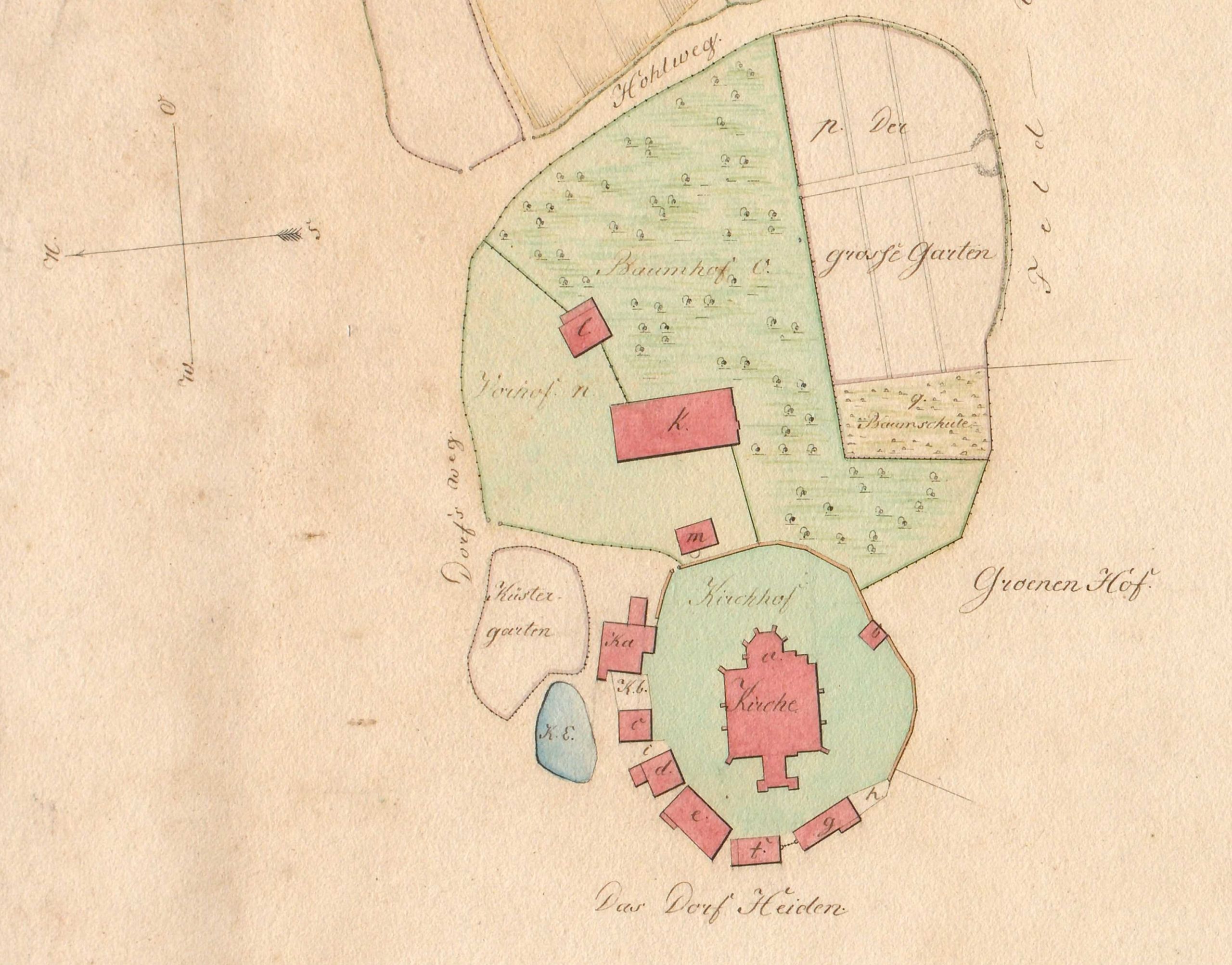 Heiden, Kirche und Kirchplatz-Bebauung, L. Reinecke, 1828, Landeskirchenarchiv 01-01-2554 (Ausschnitt)