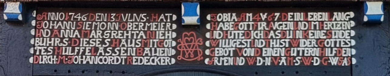 Die Inschrift des Torbogens von 1746 weist die Erbauer Obermeier und Nie(h)buhr aus, 2024, Foto: Margit Lenniger.