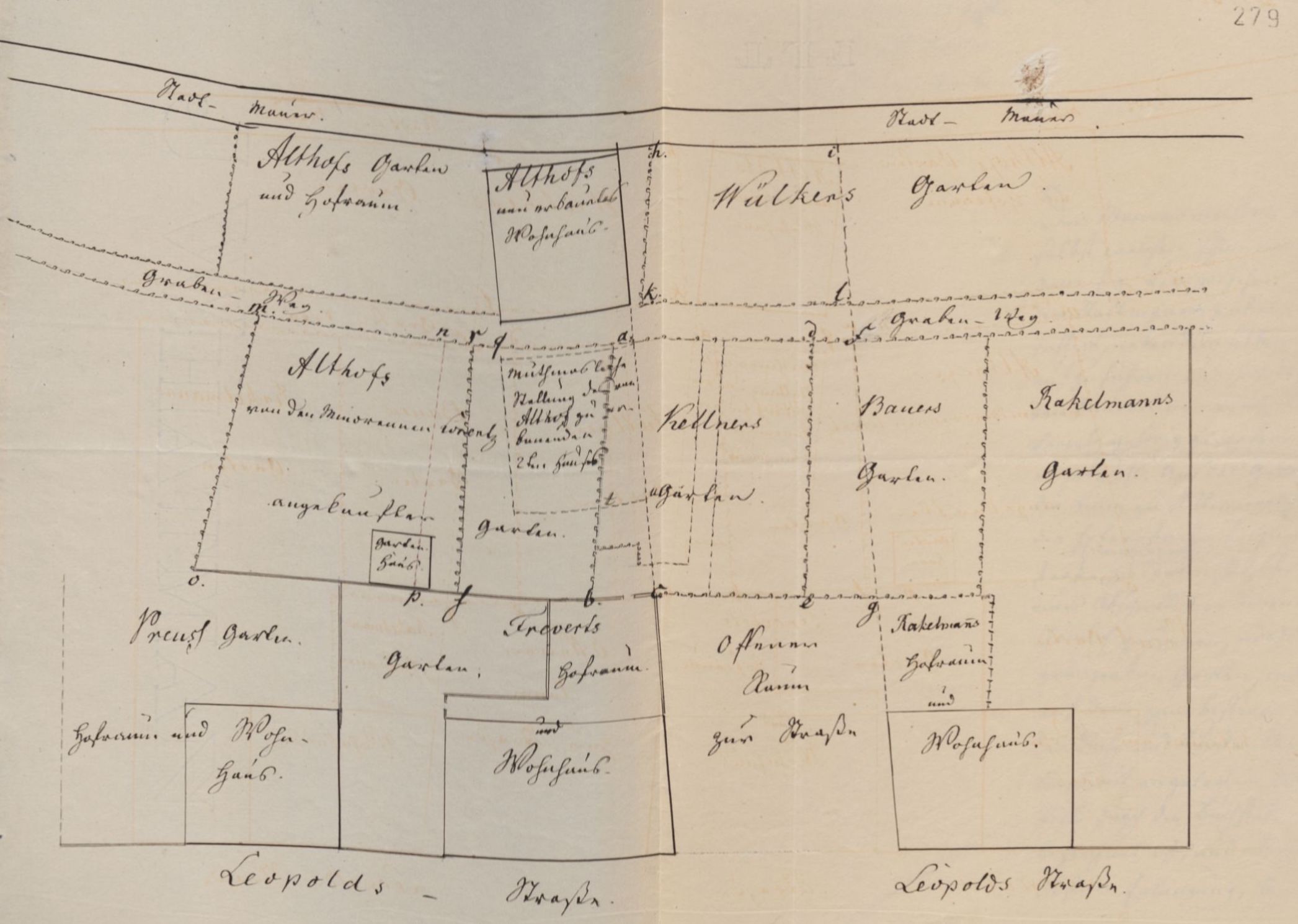 Baufeld zwischen der Stadtmauer und der Leopoldstraße mit dem geplanten Durchstich der Exterstraße, 1840, LAV NRW OWL, L 77 A Nr. 121, fol. 279