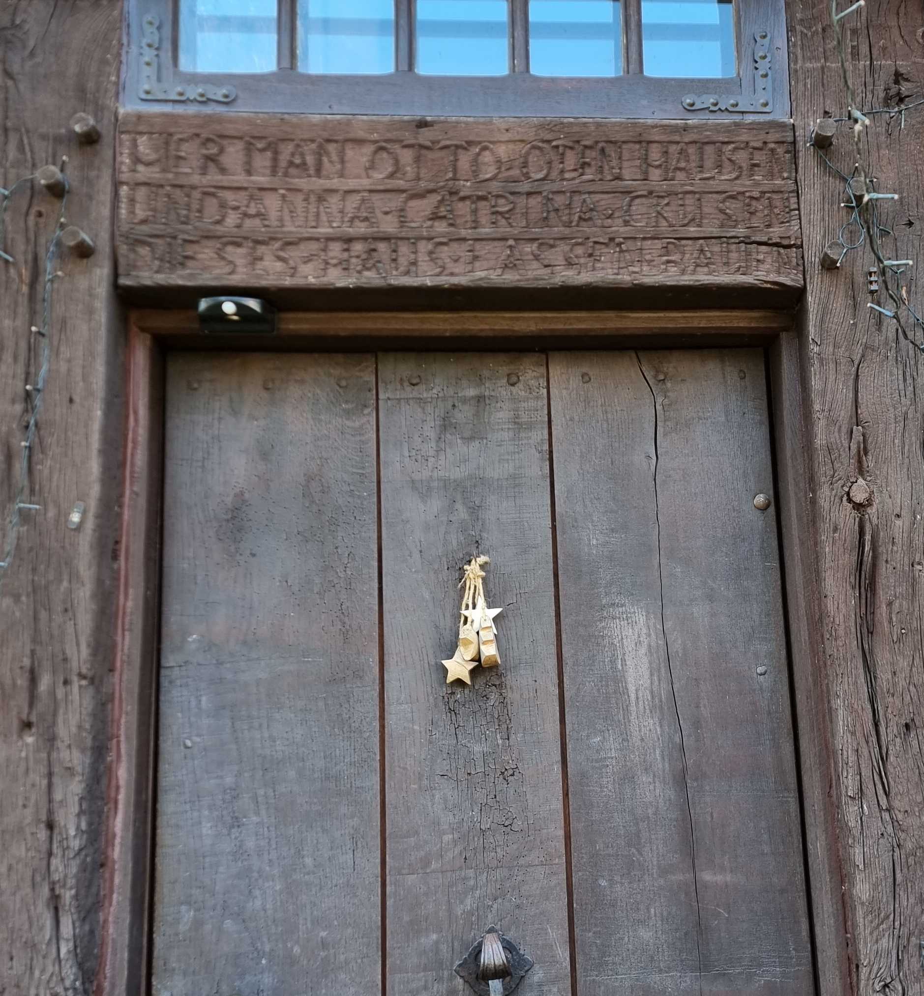 Inschrift über der Tür des ehemaligen Speichers der Hofanlage, 2025, Foto: Margit Lenniger.