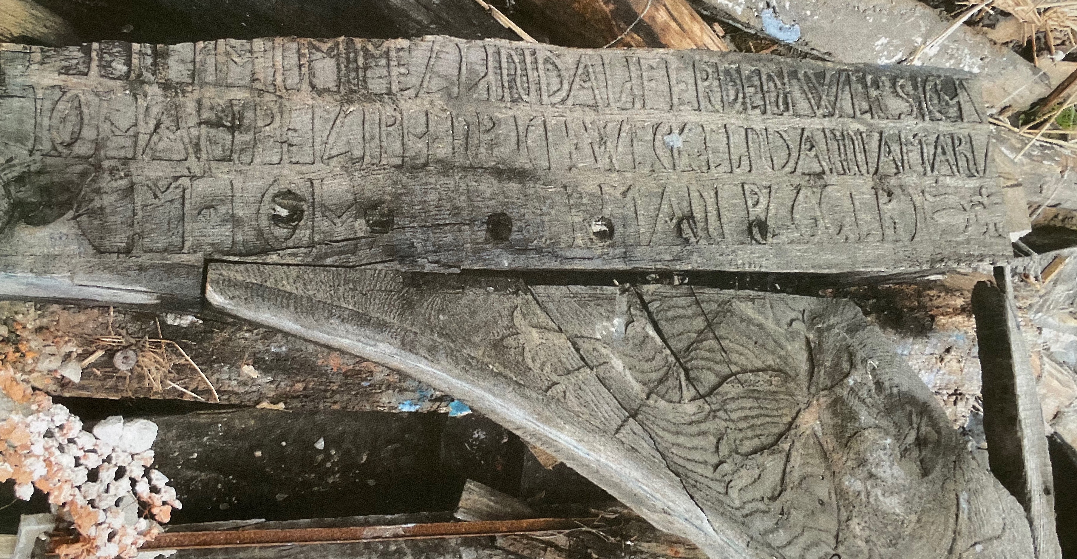 Torbalken-Fragment der Stätte Hörste Nr. 38, nach Abbruch des Hauses 2015, Foto: Thomas Vogt, erkennbarer Textausschnitt: . . . . . HIMMEL UND AUF ERDEN WER SICH V . . . ,