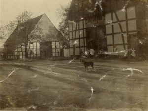 Lohmannshof, Haupthaus (rechts) und Pferdehaus/Schoppen (links), um 1900 (LLB: ME-PK-34-49)
