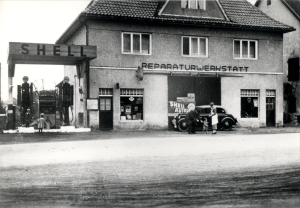 Schmiedewerkstatt Runte mit Tankstelle, um 1940, LLB: ME-PK-38-20
