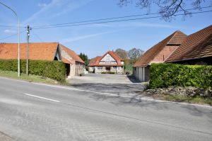 U-förmige Hofanlage, am Ende das Anf. 20. Jh. neu erbaute massive Wohnhaus mit Fachwerkgiebel und Mansarddach, links und rechts Stallungen und Scheune in Mauerwerk (Bruchstein, Aufstockung in Backstein) mit Satteldächern.