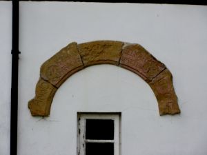 Inschrift von 1666 am steinernen Bogen der Eingangstür (mit Wappen beider Personen!)