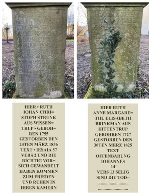 Grabstein der Eheleute Strunk/Brinkmann an der Kirche in Stapelage (ihr Geburtsjahr - eher als 1727 lesbar - ist 1747), 2025, Fotos: Dr. Horst Wissbrock