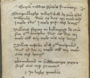 Heberegister des Klosters Marienfeld von 1456 (Ausschnitt): Auf den Meier zu Stapelage folgen Obermeier und Niedermeier zu Billinghausen, dann Brinkmann zu Hiddentrup; danach beginnt Kirchspiel Lage; LAV NRW W, W 005 / Msc. VII, Nr. 1308, S. 7