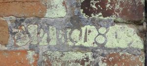 Kornspeicher von 1819 (abgebrochen 2002): Backstein mit vor dem Brand eingeritzter Jahreszahl 1819.