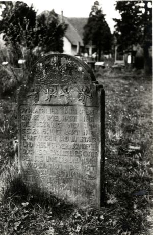 • Nr. 5: Ein vertikal zweigeteilter Sandstein, oben beide Teile jeweils mit eingerückten Halbkreisbögen geschlossen. Der Stein muss ursprünglich tiefer im Erdreich gesteckt haben, daher ist anzunehmen, dass er hier nicht mehr in situ steht. Die Inschriften in Flachschnitt in Antiqua-Versalien, links: "ANNO 1662/IST IOHAN CASPAR/WAHRWEG GE=/BOHREN UND 1722/GESTORBEN SEIN/ALTER 69 IAHR/IOHAN AM X.V. [X,12]/ICH BIN EIN GUTER HIRTE EIN GUTER/[nicht mehr gut lesbar, aber nach dem NT zu ergänzen: HIRTE LÄSST SEIN LEBEN FÜR DIE SCHAFE]“, rechts: „ANNO 1647/IST IOHAN CASPAR/WAHRWEG SEINER/ANNA CATHARINA/WAHRWEGS GEBOH/REN UND 17 IN DEM/HERRN ENTSCHLAFEN/IHRES ALTERS […]/[…]." Das Todesjahr der Ehefrau ist nicht eingemeißelt – nur das Jahrhundert, nicht Jahr und Jahrzehnt. Offenbar wurde der Stein schon beim Tod des Mannes vorbereitet und später nicht vollendet, vielleicht auch, weil Anna Catharina andernorts gestorben ist?