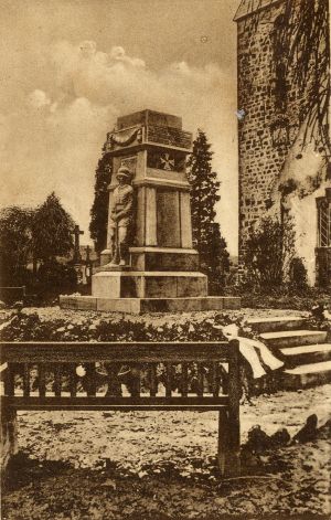 Das Kriegerdenkmal wurde Anfang der 1920er Jahre im südöstlichen Bereich des Kirchhofs errichtet.[20] Es war als gestufter Natursteinpfeiler mit quadratischem Grundriss auf einer leichten Geländeerhöhung gestaltet, zu der von Osten vier Stufen führten.[21] Über der Sockelplatte verjüngte es sich um zunächst eine Stufe, auf der Richtung Norden auf einem kleinen Vorsprung die Statuen einer Mutter mit Kleinkind standen, auf der Südseite ein Soldat mit aufgestelltem Gewehr und Stahlhelm. Hinter diesen erhob sich der leicht nach oben verjüngte Denkmalschaft mit Ecklisenen und einem Gesims. Diese architektonischen Gliederungen rahmten an der Ost- und Westseite Bronzetafeln mit den Namen der im Krieg getöteten Soldaten der beiden Gemeinden. Über dem Gesims, das von den Köpfen der Statuen überragt wurde, waren über der Mutter die Jahreszahlen 1914–1918, über dem Soldaten der Begriff "Ehre" im Flachschnitt in einer Rechteckkartusche vermerkt, an den Seiten jedoch Reliefs eingelassen, deren Bildprogramm im Westen auf Grund der Abbildungsqualität nicht zu deuten ist, im Osten aber das Eiserne Kreuz darstellt. Über diesem Aufbau liegt eine allseits vorkragende Platte, die wiederum von einer kleineren bekrönt wird, die die Kantenlänge des oberen Schaftendes aufgreift. Auf den Außenseiten der vorkragenden Platte ist über den Statuen ein Lorbeergehänge aus dem Stein gearbeitet, seitlich finden sich dreizeilige Inschriften, welche sich vermutlich auf die Hauptschlachtorte des Weltkriegs beziehen.