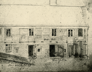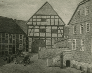 Ein von August Ebert nach älterer Vorlage 1940 gemaltes Bild[7] zeigt parallel zur Bruchmauerstraße ein den Hof nach Süden abschließendes Fachwerkgebäude des frühen 19. Jh., zweistöckig mit Satteldach. Es wurde nach Aufgabe der Brauereifunktion 1888 abgebrochen, seitdem Freifläche.[8]
