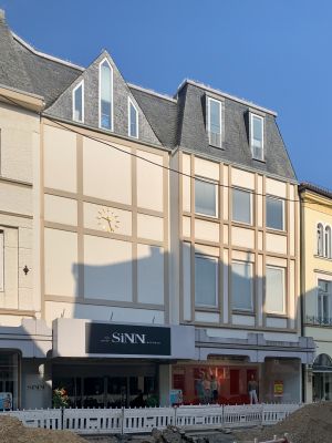 Giebelständiges zweigeschossiges Fachwerkhaus mit halb abgewalmten Mansarddach. 4 Fensterachsen, im Dachgeschoss 2 Fenster, darüber 1 Gaube. Erdgeschoss zuletzt durch Schaufensterfront verändert.