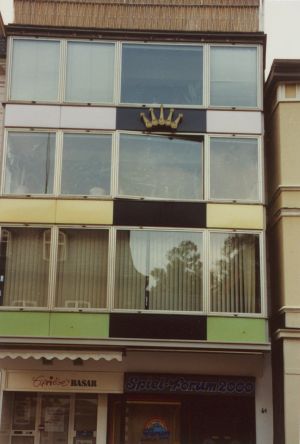 Viergeschossiges Wohn-Geschäftshaus mit zurückgesetztem 5. Attikageschoss, erbaut um 1965. Fassade mit Fensterbändern (3fach asymmetrisch geteilt) und ursprünglich farbigen Brüstungsbändern (grün, gelb, weiß) horizontal gegliedert. Im Brüstungsbereich des 3. Obergeschosses ursprünglich eine goldene Krone.[5]