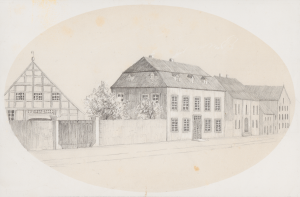 Auch die Scheune, die Umfriedungsmauer und das Hofpflaster wurden repariert und teilweise erneuert. Eine Erweiterung des Hofes erfolgte 1839/40. Ferdinand Brunes Lageplan zeigt im Norden des Grundstücks eine große Scheune, hinter dem Wohnhaus eine Wagenremise, an der Langen Straße noch einen Holzschuppen und einen kleinen Schweinestall, der sich an die Rückseite des in die Lange Straße vorspringenden Torwächterhauses lehnte.[2]