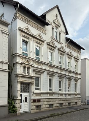 Zweigeschossiger traufständiger Mauerwerksbau mit Putzfassade und Satteldach, sechs Fensterachsen, davon die beiden mittleren mit einem Zwerchhaus überhöht. Reiches Putz- und Stuckdekor in Neorenaissance-Formen. Hoher Sockel mit Putz-Rustika, Erdgeschoss waagerechte Putznuten, Obergeschoss Glattputz. Haustür in der linken Achse pilasterflankiert, über dem Architrav Oberlicht als Zwillingsfenster mit Dreiecksgiebelchen. Erdgeschossfenster mit profilierten Rahmen, stuckiertem Brüstungsfeld und gerader Verdachung. Im Obergeschoss Fenster mit Pilasterrahmung, stuckiertem Brüstungsfeld und steilen Dreiecksgiebeln. Im Zwerchhaus gestuftes Drillingsfenster, das mittlere mit Giebel, darüber Okulus. Traufgesims mit Stuckdekor.