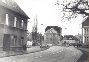 Bau des Mauermeisters Wilhelm Althof unterhalb der Schmuck'schen Lohgerberei, Bauantrag vom 11.7.1843. Althof hatte die Vorschrift des Halbwalmdachs mißachtet und sollte nach Ferdinand Merckels Gutachten vom 18.3.1843 rückbauen. Der Salzufler Salinenmeister Ludwig Gödecke hielt das Satteldach hingegen nicht für geschmacklos. Wegen der widersprechenden Urteile wurde Landbaumeister Ferdinand Brune zu einem Gutachten aufgefordert. Er befand am 2.7.1843, der gerade Giebel sei rücksichtlich des Aussehens den gebrochenen vorzuziehen, wenn auch gebrochene Giebel unter Umständen in ökonomischer Hinsicht vorteilhaft seien. Am 9.6.1843 hielt Merckel den geraden Giebel für genehmigungsfähig, doch bestand die Baukommission am 13.6. auf dem Rückbau, was sie am 27.6. bekräftigte.[1] Wie ein Foto von 1965 zeigt, blieb der Steilgiebel offensichtlich aber bestehen.