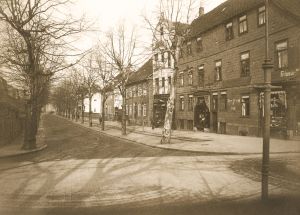 Rosental, rechts das Eckhaus Lange Straße, dann von rechts nach links die Häuser Rosental 1, 3 und 5, um 1930, LLB, HSA 6253
