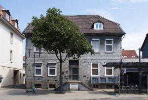 Bronzetafel links neben der Haustür: "In diesem Hause wohnte / der berühmte Tondichter / Albert Lortzing / in den Jahren 1826–1827. / Detmolder Männer-Chor e. V."