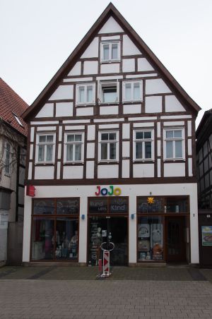 Zweigeschossiges Fachwerkgiebelhaus, von Otto Gaul "um 1800" datiert.[3] Nach Bauuntersuchung von Michael Sprenger und dendrochronologischem Gutachten 1547 über einer Brandruine erbautes zweischiffiges Längsdeelenhaus mit linksseitiger Deele, im 17. oder 18. Jahrhundert Umbau zu einem dreischiffigen Deelenhaus.[4] Hinterhaus über Gewölbekeller zunächst als eingeschossiger Saalbau, 1623 [d] zweigeschossig erneuert.
