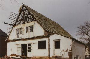 Ursprünglich 4 Fache (5 Gebinden) langer Vierständerbau mit ehemals verbretterten Steilgiebeln. In der 1. Hälfte des 19. Jahrhunderts an der Torgiebelseite um 3 Gebinde verlängert und mit Halbwalmen versehen. Wohl gleichzeitig Anhebung des Erdgeschossbodens und teilweise Unterkellerung, zusammen mit dem Anbau der massiven, ebenfalls unterkellerten Kübbung an der östlichen Traufseite. Die Anhebung erforderte die einläufige Werksteintreppe zur Haustür im straßenseitigen Giebel.